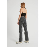 - Los jeans negros tienen un modelo de cintura alta y un lavado claro.